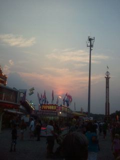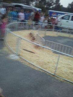 After Bingo we felt better and went on some more rides. Then at 8 we hurried over to the track to watch the pig and duck races! It was really fun and we cheered for the pigs. We bet a dollar on the pig we wanted to win and Elise's pig won so I had to give her a dollar. The lady at the track explained why the pigs race. It's because pigs LOVE oreo cookies so much, that they crumble one up and put it in the trough, and then the pigs know that the first one back in gets to eat most of the oreo cookie before the others get there! How cute is that???